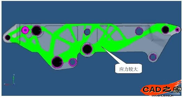 应用RADIOSS进行求解,支架上最大应力为21.6MPa,仅出现在支架局部区域,而其余部分应力都较小,图3是其整体应力分布云图,图4是其局部应力放大云图;支架上最大变形为0.003mm,发生部位如图5所示。