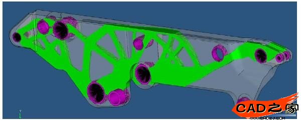 优化设计使用的方法为密度法。从优化结果来看,原始模型有的部位变薄,有的部位被挖空,而这样的材料分布也最符合应力的流向。图6是Topology优化结果的三维视图,图7与图8分别从正反两面对优化结果进行显示。其中,灰色部分为原始模型,绿色部分为单元保留部分(应力较大)。