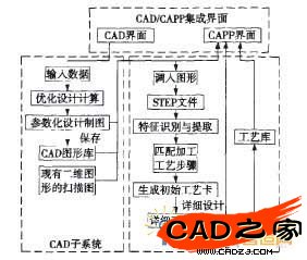 笔者设计了一种CAD/CAPP集成的方案,本集成系统由CAD特征建模子系统和CAPP子系统两大部分组成,如图1所示,本系统实现了CAD/CAPP之间很好的衔接,能够实现结构参数优化设计、产品造型和工程图的自动绘制和工艺的自动生成。