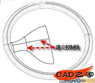 10、接着我们就要建立融合部分的曲面了。其实大家都知道这里应该切除扶手面。但在哪里切,却不是很明了。当然切不是盲目的,要有目的地切。为了保持融合曲面与扶手曲面之间痕迹不明显(其实痕迹明不明显,主要是视觉的效果,如果我们把切的地方放在高光部分,那肯定会好些。),我们在扶手曲面的中间部分开始切,而且为了保持被切后边的整体性,我们用的曲线应是一整条,这个操作步骤请参照PART文件。