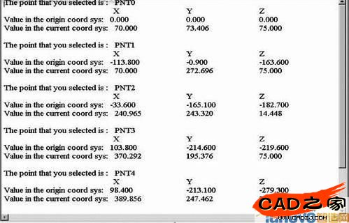 ProAsmcomppathTrfGet()函数可得到选择零件相对根装配体的转换矩阵,选择图3中的B、C零件,可得到B、C零件的转换矩阵。由于关于Pro/ENGINEER的二次开发的文章很多,在本文中就不再具体描述,通过坐标转换理论,得到如下的结果。以此图1(b)为例,通过Pro/ENGINEER的二次开发,得到如图4所示结果。为检验其转换是否正确,通过Pro/ENGINEER中的Analysis菜单可以进行测量,最终结果与转换的坐标结果一致。