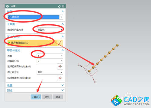 当执行点集命令后,我们需要设定的项目有:所选线的类型、曲线点的产生方法、基本的几何体、点的个数,在这些设定后,点确定。