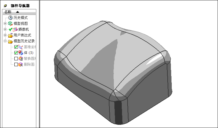 再看替换圆角后的作用,这些在其它系统是圆角的B曲面,本来一次性删不掉,识别为圆角后,NX系统可以一次性删除它了,那么对经常去圆角的人来说是一种福音: